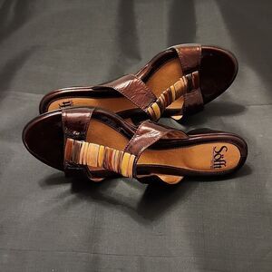 SOFFT ANITA WOMEN'S ROUND OPEN TOE SLIP-ON WEDGE SANDAL SIZE 10M COLOR DARK BROWN MADE Polyurethane sole,Anatomically correct footbed distributes weight evenly, so feet feel less soreness and fatigue. Footbed is piled high with memory foam, so you get the same great cushioning over and over again! Soft, breathable patent leather upper offers a great fit.Patent leather upper, leather upper lining and sockliner, polyurethane foam insole. Techboard midsole, polyurethane outsole. Heel Height: 2 1/4".THIS ITEM IS PRE-OWNED EXCELLENT CONDITION WITH ONLY LIGHT SIGNS OF WEAR IF ANY CHECK THE PICTURES