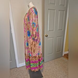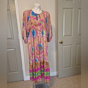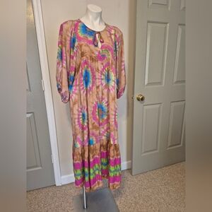 The dress is made of a lightweight fabric and has a tie-dye pattern in shades of brown, pink, blue, and green.