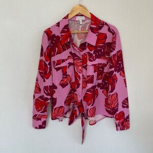 SOFIA VERGARA Women's Size XL Tropical Pink Palm Leaves Button Up Tie Blouse
