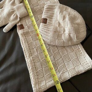 Super Soft 3 piece Hat / Glove / Infinity Scarf Set - Gorgeous Tan Knit Set. Cream Toned Lined Hat. I just love this set. It's really soft, but my hair is just TOO much for this, too big, and I wouldn't even bother to try it on. It's so soft though. I love the scarf and gloves, but just don't want to break up the set. This would be a great gift! It's BRAND new, perfect LIKE NEW condition and absolutely never worn; I say like new though because I did wash it once on gentle, just to store it, thinking I might use it at some point because it's so pretty but I never did. It's pristine, so it's a great gift and if you need it wrapped as such, with a card, just send me your message and let me know :-).