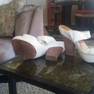 Really cute and super comfy white leather block heel. Has some very minor scuff, can be polished. The leather and in sole is soooo nice. Your "go-to" summer shoe.