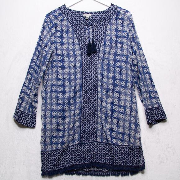 SOFT JOIE Batik Floral Tunic Top Gauzy Cotton Fringe Tassel Blue Boho Beach Sz M