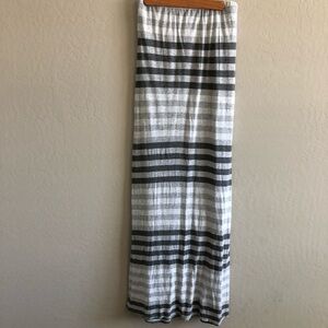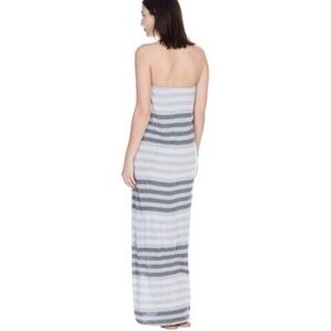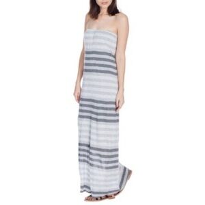 A casual strapless dress in super soft striped jersey, our Boyce B dress features a flattering drawstring waist with blouson top and flowy skirt with slightly longer back hem that hits mid-calf. A casual wardrobe staple that's easy to throw on and go all season long. Stripe Jersey. 100% Rayon. Dry Clean. Designed and Manufactured in Los Angeles with Imported Materials. Model Is Wearing Size Small. Colour: grey