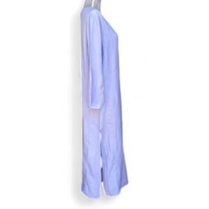 Effortless and timeless, this SOFT SURROUNDINGS tunic dress is crafted from 100% linen in a soft lavender hue. Designed with a relaxed fit, deep split neckline with loop button details, and side slits for ease of movement. Perfect as a breezy dress, beach cover-up, or layered tunic. A versatile piece that blends comfort with understated elegance.