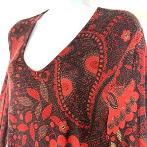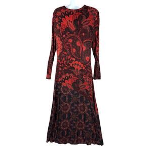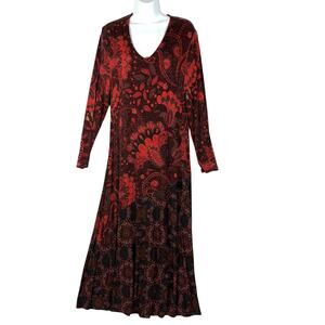 Soft Surroundings Zanzibar v-neck dress features a paisley print with a rich red and black peacock pattern. The fabric is a soft, stretchy viscose jersey knit that features a vibrant, bohemian-inspired, paisley peacock print on the top. The bottom of the dress is a contrasting panel of black with red medallions, cut in diagonally from hip to the just below the knee. This mood-boosting holiday maxi dress is finished with long sleeves and a feel-good drape. Styled from soft jersey knit.