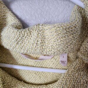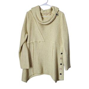 Up for consideration is a preowned SOFT SURROUNDINGS Knit Asymmetrical Pullover Sweater. Features a cozy cowl neck with button detail, textured knit, and unique side button accents. The butter yellow / neutral tone makes it easy to style for fall or winter. Size Large. This garment is in great condition with lots of life left.