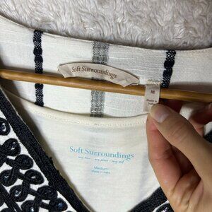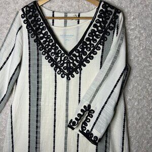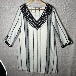 Keywords: tunic dress, embroidered dress, v-neck dress, striped dress, cover-up, beach dress, casual dress, soft surroundings, bohemian dress, resort wear, vacation dress, 3/4 sleeve dress