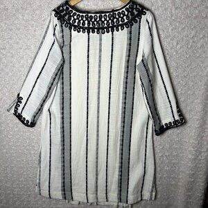 Elegant tunic dress featuring a sophisticated black embroidered V-neck design and stylish vertical stripes. This eye-catching piece offers a flattering silhouette and comfortable fit, making it a versatile addition to your wardrobe. The 3/4 sleeves are finished with matching embroidery, adding a touch of refinement. Perfect for a casual brunch, a day at the beach, or a relaxed evening gathering.