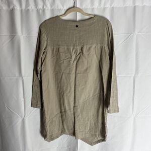 The SOFT SURROUNDINGS Linen Cotton Button Up Top is a boho-inspired piece perfect for resort wear or casual outings. Made from a lightweight and breathable blend of linen and cotton, this top features a collared neckline, button closure, and 3/4 sleeves. The beige color and solid pattern make it versatile for all seasons, while the wide straps and tunic style offer a comfortable fit. Ideal for travel, workwear, or simply relaxing in a bohemian-inspired setting, this top with accents of nature, Western, and hippie themes will add a touch of character to any wardrobe.