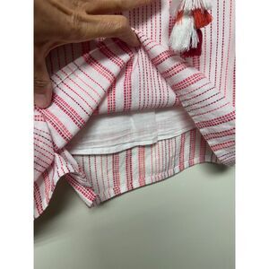 White tunic top with red stripes, similar to a candy cane. Embroidery at the neckline. V-neck or keyhole front with tassel ties. 3/4 sleeve. Fully lined.