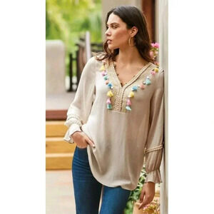 SOFT SURROUNDINGS Tunic L Clementine Tasseled Embroidered Beige Boho V-neck Top