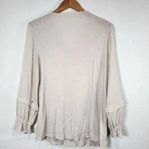 This Soft Surroundings tunic blouse in size L is perfect for any occasion, whether it's a casual day out or a party. The beige color and bohemian style make it a great addition to any wardrobe. The V-neckline and balloon sleeves add a touch of elegance, while the tasseled and embroidered accents give it a unique and fun flair.