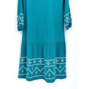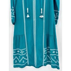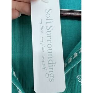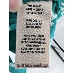 The SOFT SURROUNDINGS Women's Jolie Tropical Green Embroidered Dress in size XS is a stylish and lightweight dress perfect for travel or casual occasions. Made from 100% cotton with embroidered accents, this midi-length dress features a V-neckline, long sleeves, and a tie closure. The bohemian and tropical theme of the dress embodies a relaxed and feminine style, making it a versatile piece for any season. Hand wash only to maintain its quality, this dress is a must-have addition to any woman's wardrobe.