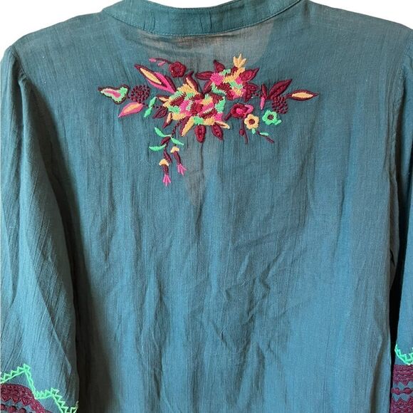 SOFT SURROUNDINGS Teal Embroidered Peasant Blouse Tunic
