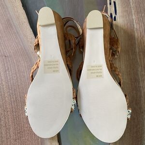 New Soft Surroundings Myra Sandals Braided straps Tie up laces Metallic woven at ankle and toe part Padded footbed Approx 2” wedge heel