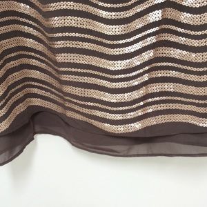 Taupe brown color with gold sequins on front and back. Side zipper. New, never worn. Missy size Medium. Center back length: 30".