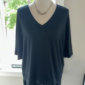 Black two-piece set includes cropped tie waist pants and oversized v-neck top