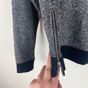Cozy textural knit. Relaxed sweater fit. Banded trim featured throughout. Round neckline. Long sleeves with cuffs. Zipper features at sides. Straight hemline. Unlined. Pullover design. 80% polyester, 20% cotton. Machine wash cold, tumble dry low.