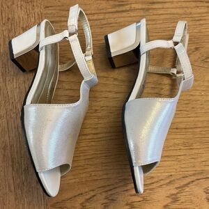 SOFT STYLE. WHITE SPARKLE SANDALS. NEW. SUPER CUTE STYLE, INCREDIBLY COMFORTABLE. SILVER/WHITE HEEL. PLEASE NOTE THERE IS A SMALL LINE ON THE HEEL THE RIGHT SHOE. THIS DOESN’T AFFECT THE LOOK OR COMFORT OF THESE GREAT SHOES.