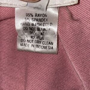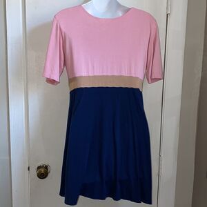 Rayon spandex blend for a soft luxe feel, Colorblock design with pink v neck top, tan empire strip and navy split front bottom. Size Small, measures 18” from armpit to armpit and 31” from top of shoulder to bottom hem.