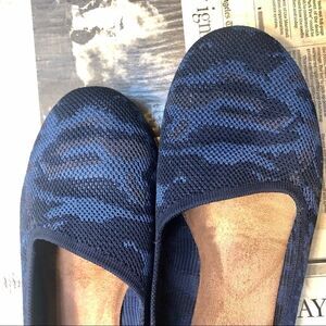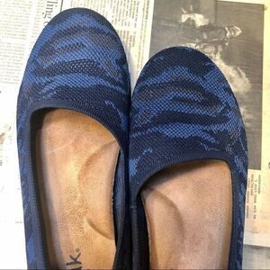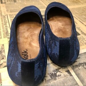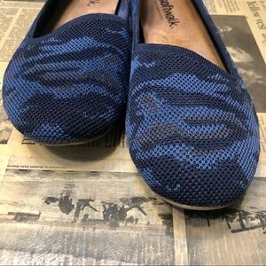SOFTWALK Sicily comfortable and stretchy sustainable woven round toe ballet flats in blue camouflage multi-weave textile knit, size 11 Wide. Unlined and breathable knit uppers, roomy rounded toe, asymmetrical décolletage. Comfortable faux suede fixed footbed. Flexible slip-resistant textured rubber sole.