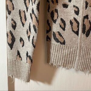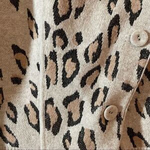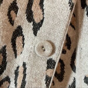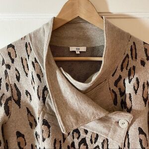 SOH Womens Cashmere and Merino Wool Cardigan Sweater in Leopard print. Cashmere and merino wool blend. Raw edge trim. Vegan Leather elbow detail. Size P which equals a size XS.
