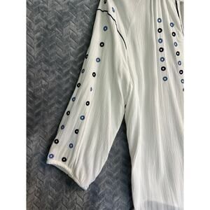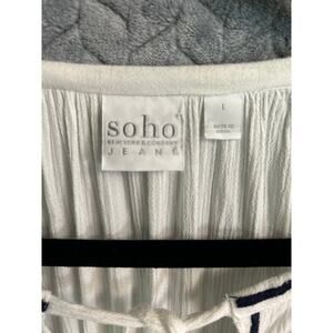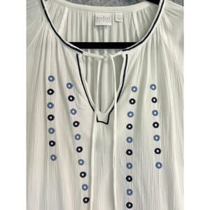 Ladies size large white gauze peasant blouse by SOHO Jeans New York. Lovely light and dark blue embroidered accents at the neckline and down the arms. V Neck with tie. Fresh, airy an light.