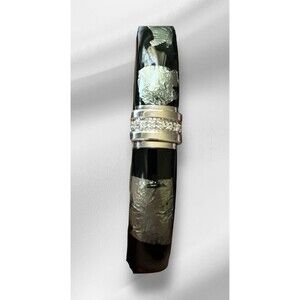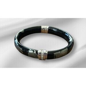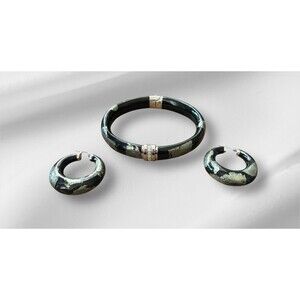 The SOHO SLVR Bangle Bracelet and Earrings are a stunning set of fine jewelry made of 14k white gold with a sleek hinged bangle style. The bracelet feature 8 sparkling white/colorless diamonds and white gold leaf on black enamel design, adding a touch of elegance to any outfit. Crafted in Italy, these versatile pieces are perfect for both everyday wear and special occasions, making them a versatile addition to any jewelry collection.