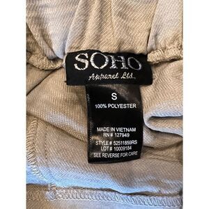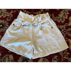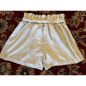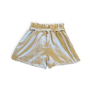 Silky dress shorts made of 1001% polyester, Feature gathered waistband, removable tie belt, faux front pockets and front pleats, Laying flat measure 14" waist, 21.5" hips and 5" inseam.