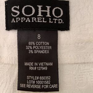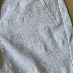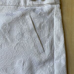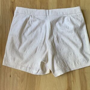 Beautiful white shorts have a floral pattern stitched all over them. Two faux pockets. Front zipper with double hook closure. No stretch. Unlined. Light sheerness. Waist flat across is 17”. Length is 14”. Great condition.
