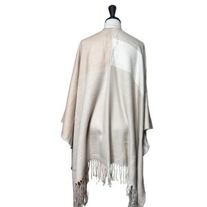 Super soft and perfect for sweater weather! Made in a light color block design in a pale pink and cream pattern. Throw on over a cozy sweater or tank and wear with leggings and boots for a casual comfy look. Made of 100% acrylic has an open front and fringed trim. Measures 39" from shoulder to the hem.