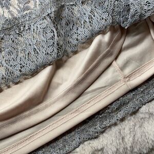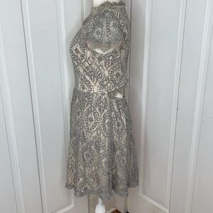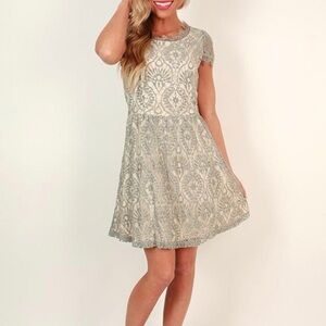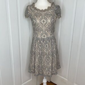 Roman Holiday Lace Dress in Grey, with Nude Lining. Sleeves are Lace & Capped. Back has 2 Zippers, & an Open Back in Between.