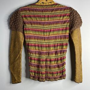 This is so unique! It’s 90% alpaca and 10% silk and filled with lots of colors and textures. The cap sleeves are puffy like. The chartreuse buttons are oval and sweet. No issue. Pit to pit 16.5” and total length is 22.5”