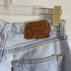 Made in the USA. 501 – mid-high rise, straight leg, authentic vintage light wash. Pristine vintage condition – no stains, rips, or wear. Tag loose.Button fly, red tab, original leather patch, orange stitching, made for women