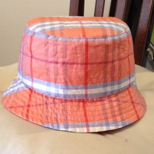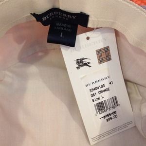 This hat is so cute! Orange Signiature Burberry plaid and made of 100% silk. Size Large but I have a normal sized head and it fits perfectly. New with tags. Original price is $155 but got on sale for $99.