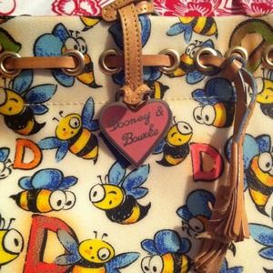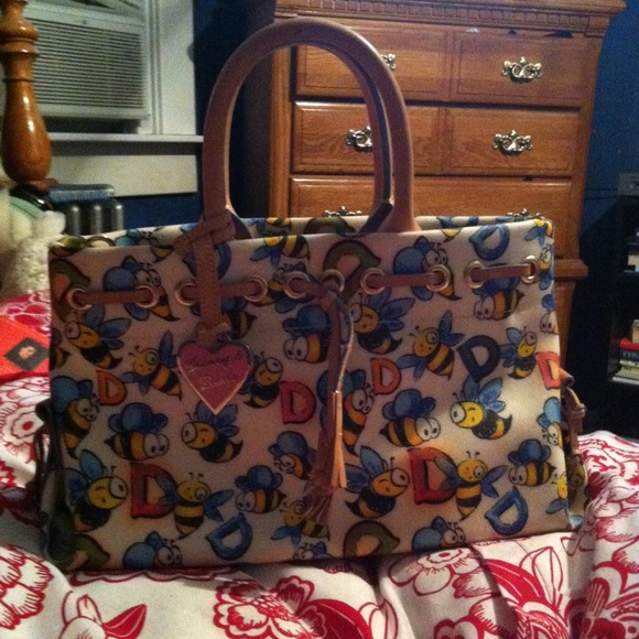 D and bees all over. Medium size. Used it a few times. No tears or stains. Gentle use. Very cute bag.