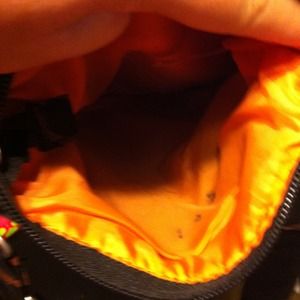 Very cute! Has one big pocket and one little pocket. It's brown with black dots on it!
