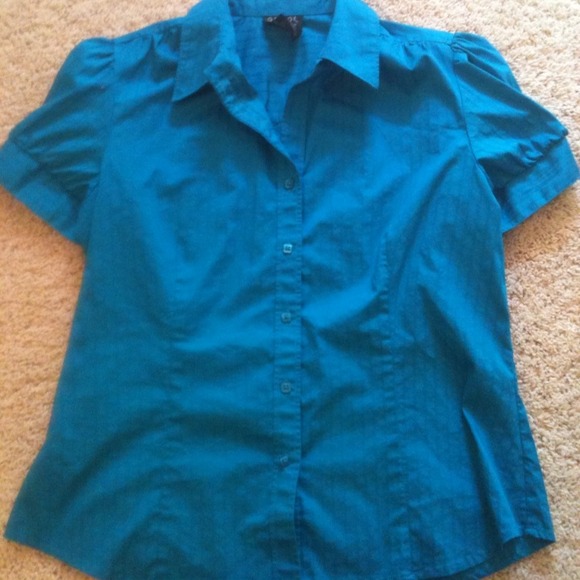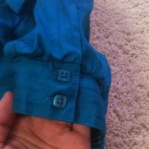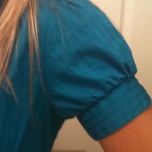 Pictures don't do the color of this top justice! It's a gorgeous blue button up shirt with really cute sleeves. Looks amazing with black dress pants or dark blue denim jeans!