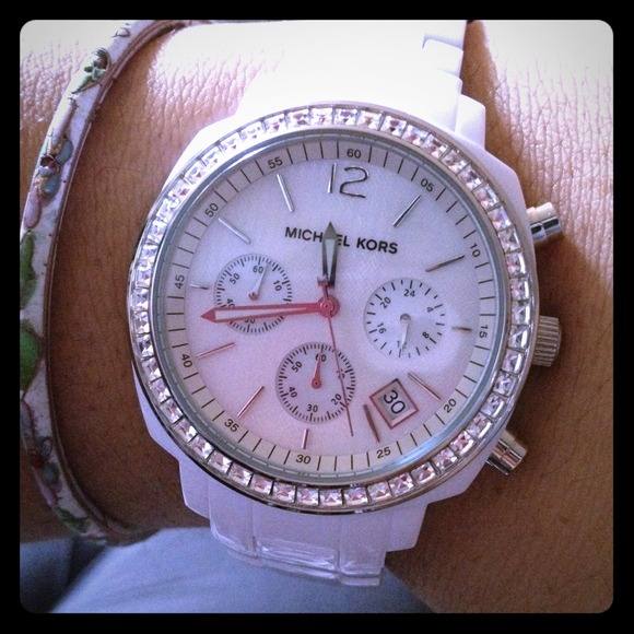 White with silver Michael Kors watch. Will come with original box and MK watch book. Can get links added or removed from Nordstroms or any watch company. No scratches and it's almost new.