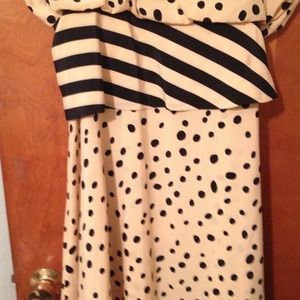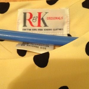 Pretty yellow with black poka dots. Has a long tie for the side. Been in my closet. A gift that I never wore. Third pic is the closet to the color