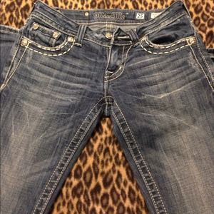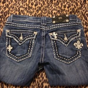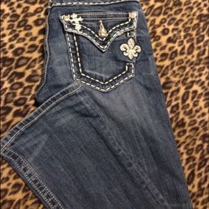Dark wash Miss Me jeans with diamond accents! Cute, and fashionable! I bought these last summer. They are in great condition except for a little wear on one of the bottom hems with a tiny hole. Otherwise they are perfect! :) Also willing to trade, and could negotiate the price. :)