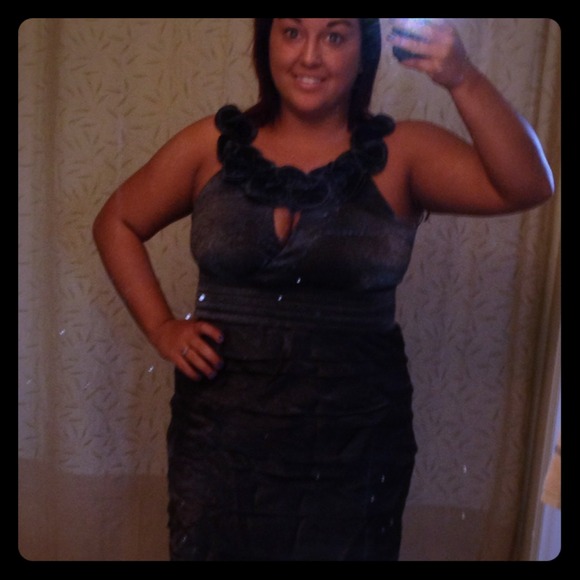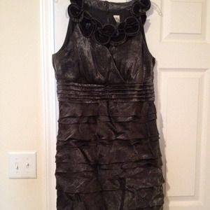 Awesome silver cocktail dress. Beautiful detailing around the neckline, and very flattering layering from waist down. Side zip with keyhole opening on the chest. Only worn once, received a ton of compliments.