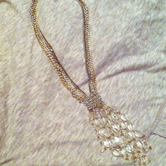 Chain is made up of gold, silver, and dark silver strands w different sizes of crystal beads on bottom. Goes great w most outfits!