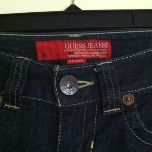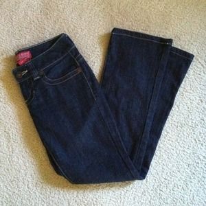 Dark blue jeans. Slightly flared at the bottom. I love these jeans but they are too small for me now. They are a 24. Which makes them a 3/4 size.