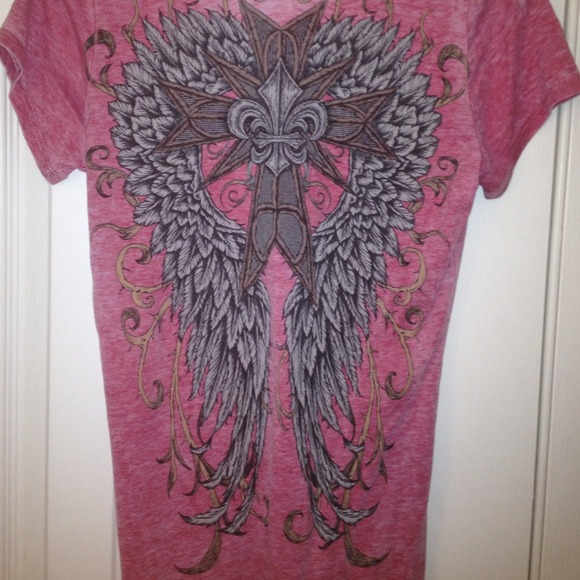 This top is brand new and would be perfect with jeans! It features an angel wing cross graphic across the back! The front is a V neck with a small cross sewn on the front right side! The top is a size large and is new with tags!