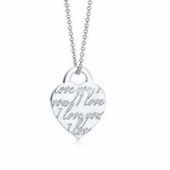 Authentic Tiffany & Co. Sterling silver necklace with heart pendant. Pendant has repeating words 'I love you' in script on 16" chain. Comes with Tiffany pouch.