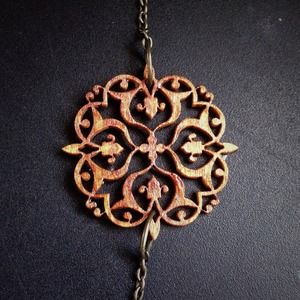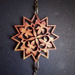 Hand laser cut stained glossed birch wood with antique brass chain. Has a clasp closure. Chain is about 18". Handmade with love by Ellen Rose. (Me!)