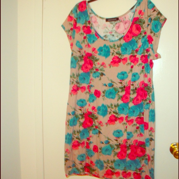 This is a never worn without tags floral dress perfect for spring and summer! The dress is beige with pink and blue bright floral pattern. The dress can be worn alone Or with tights.