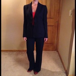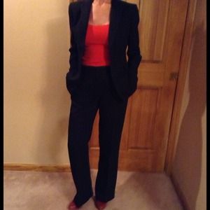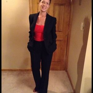 Kasper 2-piece pants suit; black with red pinstripes. Worn 1 time shoulder 16 inches inseam 30 arm 22 3/4