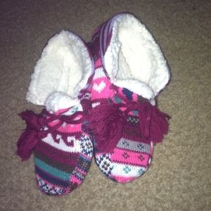 Multi color slippers... Soft soft soft cozy, cute and can be worn with top up or down( it folds ). Good for around the house and lounging. I bought a pair and ended up going back buying 4 more because they are so sturdy and warm. These are an extra pair that I want someone else to agree and love. These really are fantastic.